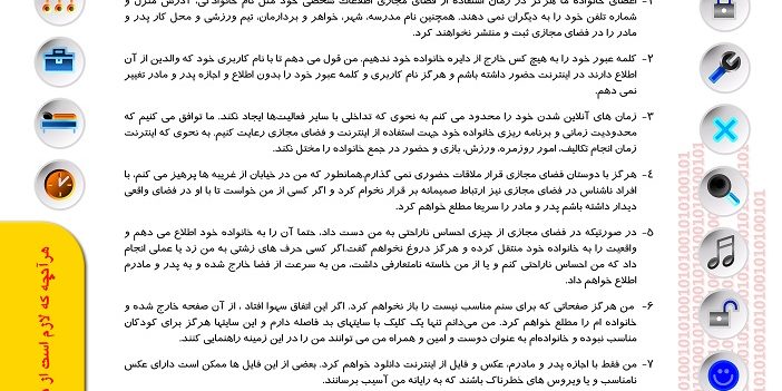 – هرگز تصاویر نامناسب یا چیزهایی را که هویت شما را به نمایش میگذارند ارسال نکنید. (برای مثال: عکسهایی که در آن بر روی لباس شما نام مدرسه یا شهر شما نوشته شدهاست)